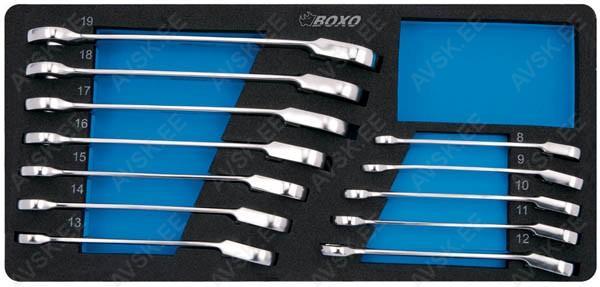 Tööriistad asuvad pehmetes "EVA"-paneelides. Paneelide pesa on teist värvi, mis aitab märgata puuduva tööriista kuju. -Avainväli 1/4", 5/16", 11/32", 3/8", 7/16", 1/2", 9/16", 5/8", 11/16", 3/4", 13/16", 7/8", 15/16" Tööriistad asuvad pehmetes "EVA"-paneelides. Paneelide pesa on teist värvi, mis aitab märgata puuduva tööriista kuju. -Avainväli 8, 9, 10, 11, 12, 13, 14, 15, 16, 17, 18, 19mm-Muuntokappaleet neliövääntiöille: -1/4" - 10mm -3/8" - 13mm -1/2" - 19mm Tööriistad asuvad pehmetes "EVA"-paneelides. Paneelide pesa on teist värvi, mis aitab märgata puuduva tööriista kuju. Avainvälit 8, 9, 10, 11, 12, 13, 14, 15, 16, 17, 18, 19 mm