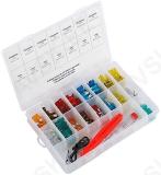 Kahvelkaitsmete ja mini kahvelkaitsmete komplekt koos universaalse testriga. mida saab kasutada pinge tuvastamiseks vahemikus 6-24 V. Komplektis spetsiaalne haarats. Kvaliteetsest tsingisulamist kaitsmed.