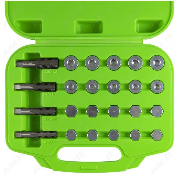 Mootori karteri rikutud õlikorgi keerme taastamise komplekt. 24-osaline. plastkohvris. Sisaldab keermelõikurid ja uued õlikorgid koos vasest tihendusseibiga.