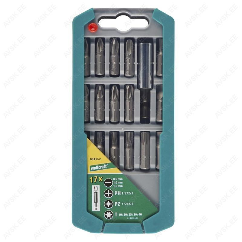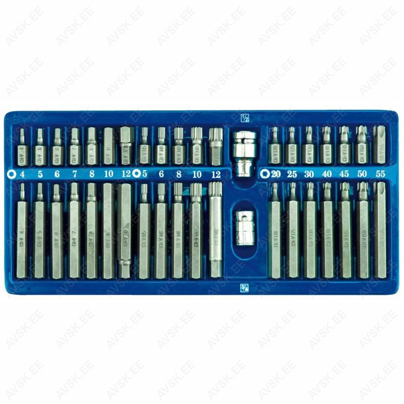 Torx-avaga: 2xTB10, 3xTB15, 2xTB20, 3XTB25, 3xTB30, 2xTB40; 2xPZ1, 2xPZ2, 2xPZ3; PH1, PH2, PH3 SL: 5.5 , 6.5 , 8 mm HX: 4, 5, 6 mm; 1 PC - Quick Release Magnetic Bit Holder 33-osaline eriotsikute komplekt. TORX auguga 8,10,15,20,25,27,30,35,40. auguga kuuskant: 2,2.5,3,4,5,6 mm. TORQ set: 6, 8, 10 mm. Hark: 6, 8, 10mm. Tri-wing 1, 2, 3, 4 mm. 14 otsikut 50mm pikad: lapikud 5 ja 6 mm; kuusskant 2, 2,5, 3, 4, 5, 6 mm; TORX T10, 15, 20, 25, 30, 40 7 padrunotsikut 35 mm pikad 5.5, 6, 7, 8, 10, 12, 13 mm 2 vööhoidjat, 1 magnetadapter 5 kahepoolset otsikut 110mm pikad: 3 x PH 2 ja 2x PZ 2 6 kahepoolset otsikut 65 mm pikad PZ 1, 2, 3 ja PH 1, 3 lapik 5 mm 2 otsikut 100 mm pikad PH 2 ja PZ 2 adapter 65 mm 5 metallipuuri 1/4" sabaga... for security screwssuitable for electric drillsscope of delivery: 9 bits, 25 mm, T-Star tamperproof (for Torx) T8 - T10 - T15 - T20 - T25 - T27 - T30 - T35 - T406 bits, 25 mm, internal hexagon tamperproof 2 - 2.5 - 3 - 4 - 5 - 6 mm3 bits, 25 mm, four-panel offset 6 - 8 - 10 mm4 bits, 25 mm, staples 4 - 6 - 8 - 10 mm4 bits, 25 mm, three-panel size 1 - 2 - 3 - 43 bits, 25 mm, cross slot PZ1 - PZ2 - ...