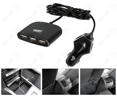 2 esimest usb-pesa 4800 mA ja 3 tagumist usb-pesa 6800 mA (180 cm kaabel) koos kinnitusega tagaistme tasku või ventilatsiooni võre külge