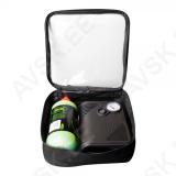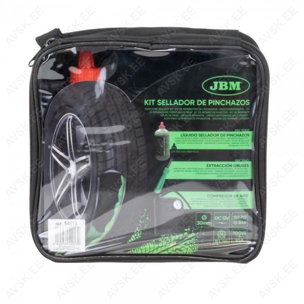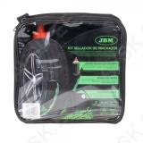 Rehviremondi komplekt teel rehvi parandamiseks. Komplektis 500 ml spetsiaalne tihendusaine. millega parandada väiksemad ja keskmised augud (kuni 6 mm) ning 12 V toitega kompressor. millega on võimalik rehv uuesti täita pärast lisamist. Tooted pakitud lukuga tekstiilkotti. Asendamatu toode. kui minna reisile või ja autodele. millel puudub varuratas!
