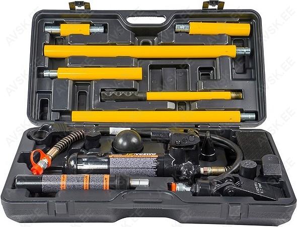 Kereosade surumiseks. kinnitamiseks ja laiendamiseks. Kaasas on hüdrauliline käsipump/rõhusilinder 4 t. 5 pikendusadapterit. surveplaat ja erinevad otsakud. Stabiilses käepidemega plastkohvris.
