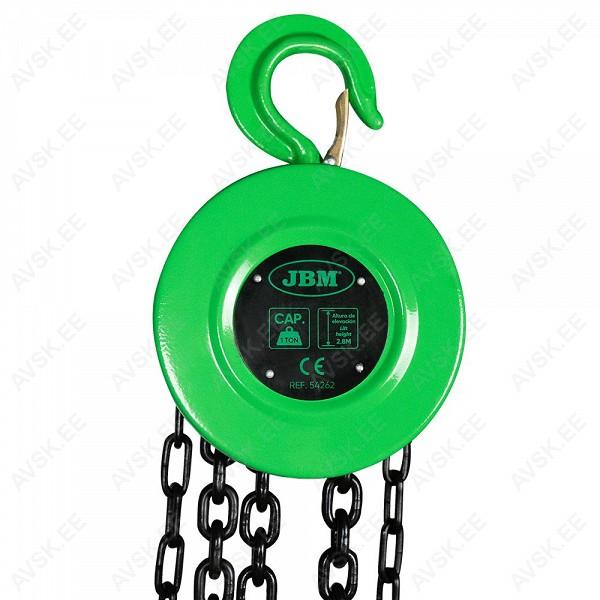 Klassikaline kett-tali. millele on JBM insenerid lisanud mõned olulised uuendused mugavamaks kasutamiseks. Ideaalne kasutada autonduses. põllumajanduses. laevanduses. ehituses jne. Lukustuskeelega. 360° ümber oma telje pöörduvad konksud. Tõstekõrgus 2.8 m. Keevitatud silmustega tõstekett on valmistatud spetsiaalterasest Steel 20Mn2. silmuse mõõt 6x30 mm. käsitsi tõmmatava plokk-kordisti kett on valmistatud terasest Steel Q235. silmuse mõõt 4.5x25 mm. Plokiosa korpus kaetud pulbervärviga.