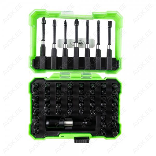 Mugavas plastist kohvris 1/4" kuuskant otsikud. Lühikesed 25 mm ja pikad 65 mm. Sisaldab lapikotsad. PH-ristotsad. PZ-ristotsad. Torx otsad ja avaga Torx otsad. Keeramisadapter 60 mm.