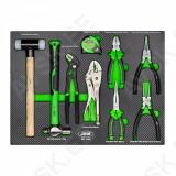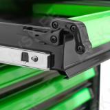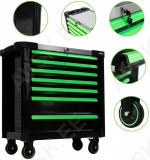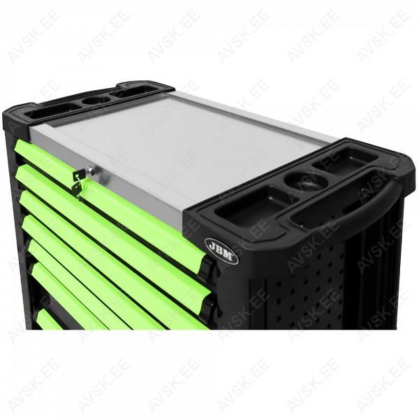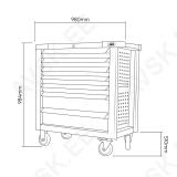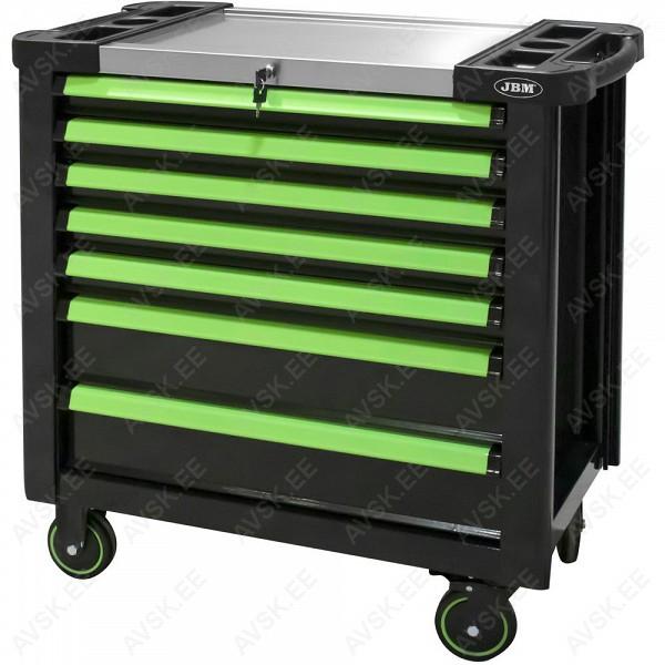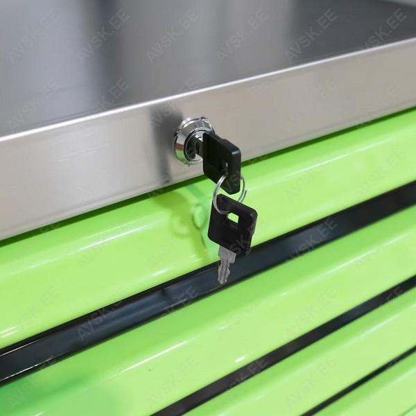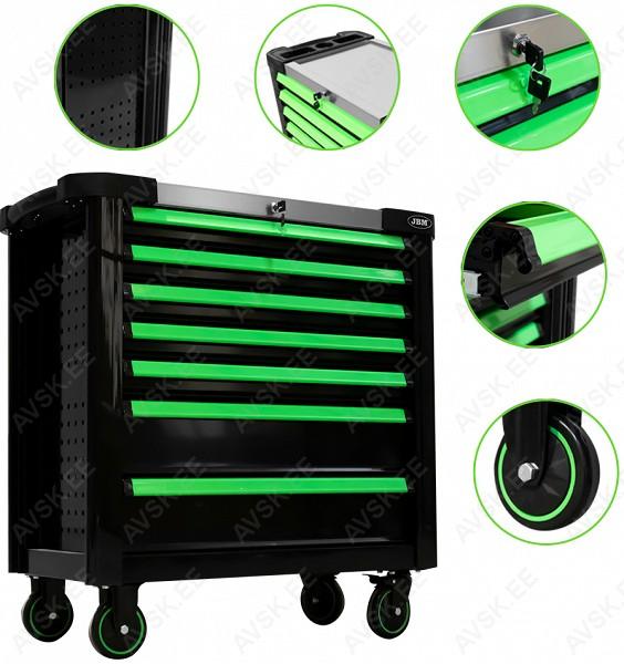 XL-mõõdus lai tööriistakäru. roostevaba INOX ülaosa. Uuema põlvkonna postraam konstruktsioon. Külgedel avad tööriistade riputamiseks. Plastkate kapi ülaosas. mis kaetud inox roostevaba plaadiga. Individuaalse lukustusega sahtlid - ei vaju käru seest välja transportimisel ja käru ei kuku ümber. Soovi korral lisaks tsentraallukustus kõikidele sahtlitele korraga. Kummikattega rattad. millest 2 tk piduriga ja pööravad. Sahtli mõõdud 705x400 mm. Käru kõrgus 984 mm. laius 980 mm. sügavus 510 mm. KATTEV VALIK TÖÖRIISTU!