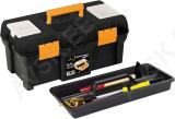 Modernse disainiga tööriistakast. millel on vastupidav konstruktsioon ja süvisesse keeratav käepide. Valmistatud taaskasutatavast löögi-. õli- ja keemiakindlast polüpropüleen plastist. Pestav. ei ima niiskust. Vastab REACH nõuetele.