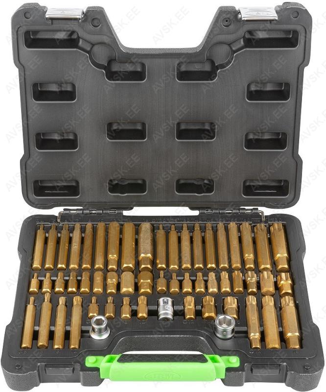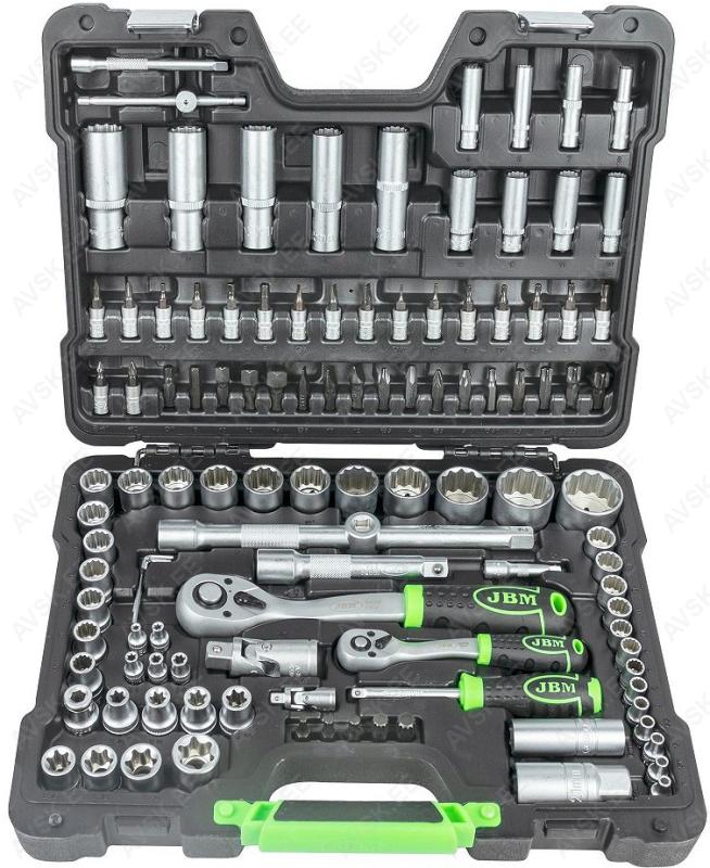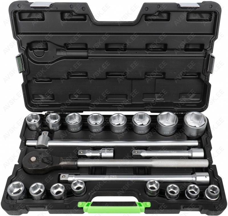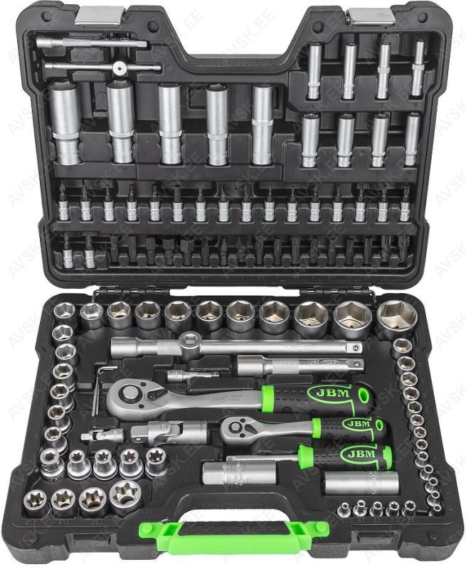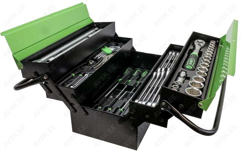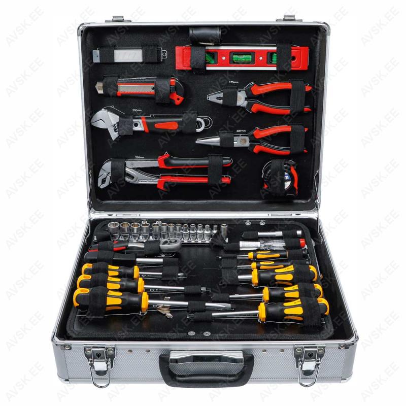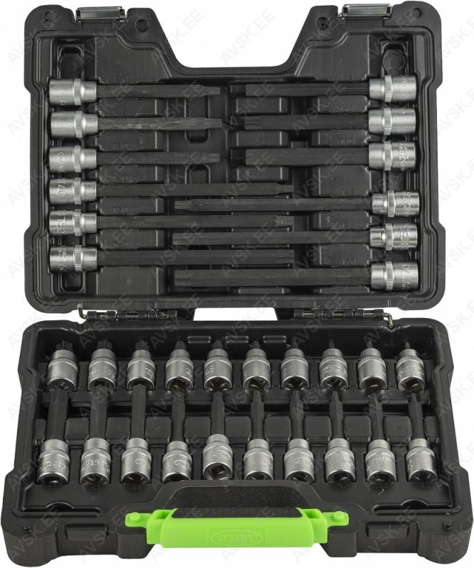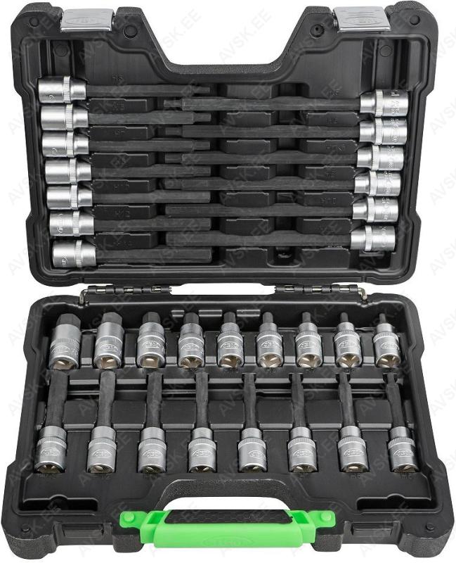 Komplektis mõõdud: 27, 29, 30, 32, 33, 34, 35, 36, 38, 41, 43, 46, 48, 50 mm Mõõdud: 66 mm / 6k, 74 & 76 mm / 15k, 76 mm / 8k, 76 mm / 12k, 76 mm / 14k, 86 mm / 16k, 86 mm / 18k, 92 mm / 10k, 93 mm / 15k, 93 mm / 45k, 96 mm / 18k, 106mm / 15k, 108 mm / 15k, 108 mm / 18k ja kolmijalka-avain 65-120mm. Adapteri 3/8" - 1/2". Mõõdud: 6, 7, 8, 9, 10, 11, 12, 13, 14, 15 16, 17, 18, 19, 20, 21, 22, 23, 24 mm Avainten räikkäpäät on varustettu innovatiivisilla tartuinkynsillä, jotka pystyvät tarrautumaan vielä jopa 85 prosenttisesti pyöristyneeseen pultinkantaan.Sisältää avainkoot 8, 9, 10, 11, 12, 13, 14, 15, 16, 17, 18, 19 mm Tööriistad asuvad pehmetes "EVA"-paneelides. Paneelide pesa on teist värvi, mis aitab märgata puuduva tööriista kuju. 15-Osainen sarja sisältää erikoislyhyet kiintolenkkiavaimet:- 8, 9, 10, 11, 12, 13, 14, 15, 16, 17, 18, 19, 20, 21, 22 mm Tööriistad asuvad pehmetes "EVA"-paneelides. Paneelide pesa on teist värvi, mis aitab märgata puuduva tööriista kuju. 21-Osainen XZN-hylsysarja sisältää:- 50 mm pitkät M5, M6, M8, M9, M10, M12- 95 mm pitkät M5, M6, M8, M9, M10, M12- 135 mm pitkät M5, M6, M8, M9, M10, M12- 195 mm pitkät M8, M10, M12 Tööriistad asuvad pehmetes "EVA"-paneelides. Paneelide pesa on teist värvi, mis aitab märgata puuduva tööriista kuju. 24-Osainen kuusiokolohylsysarja sisältää: - 50 mm pitkät 5, 6, 7, 8, 10, 12 mm- 95 mm pitkät 5, 6, 7, 8, 10, 12 mm- 135 mm pitkät 5, 6, 7, 8, 10, 12 mm- 195 mm pitkät 5, 6, 7, 8, 10, 12 mm Tööriistad asuvad pehmetes "EVA"-paneelides. Paneelide pesa on teist värvi, mis aitab märgata puuduva tööriista kuju. 24-Osainen Torx-hylsysarja 3/8" vääntiölla sisältää:- 50 mm pitkät T20, T25, T27, T30, T40, T45, T50, T55- 95 mm pitkät T20, T25, T27, T30, T40, T45, T50, T55- 135 mm pitkät T40, T45, T50, T55- 195 mm pitkät T40, T45, T50, T55 Alumiiniumkarkassil, alumiiniumkattega külgedega tööriistakast koos volditava põhjaga, lukustatav spetsifikatsioon: 1 lõikenuga 155 mm, tera 18 mm 10 varutera, 18 mm 1 universaalne mutrivõti, 200 mm 1 veepumbatangid , 250 mm 1 tangid, 175 mm 1 "telefoni" tangid, 200 mm 1 vesilood, 230 mm 1 mõõdulint, 15 mm x 3 m 1 reveresiga knarre 6.3 mm (1/4"), 72 teeth 1 pikendus, sise/välis mõõt 6....