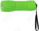Kummikattega kompaktne taskulamp mis töötab 3xAAA patareidega (ei ole kaasas). 9-LED valguselement. 27 lm valgusjõud. Käepaelaga.