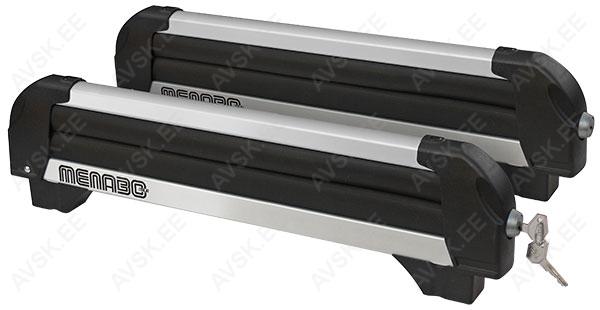 Alumiiniumist lukustatav hoidja neljale suusapaarile või kahele lumelauale. Alumiiniumtalade soontesse sobivad T-poldid on komplektis. Kandilistele taladele sobivad kinnitused lisavarustusena, tootekood 910-84700. Max kandevõime 28 kg. TUV ja City Crash heakskiiduga.