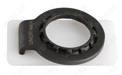 Matkavõti (Tirri- ja kodaravõti) Unior 1669/4 Kuidas kasutada: • Kodarate vahetamiseks tagumise jooksu kassetti poolsete kodarate jaoks. • Kõige pealt eemalda tagajooks ja aseta võti tirri külge. • Pane jooks tagasi nii, et võtme äär jääks raamikõrva või raami taha. Kaasas on ka plastik kaitse, mis tuleks asetada raami ja võtme vahele, et raami mitte kahjustada. Peale seda suru vänta sõidu suunas, et tirr lahti tuleks. Eemalda kassett ja vaheta katkine kodar.