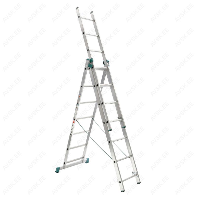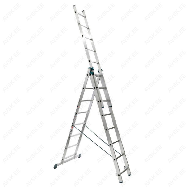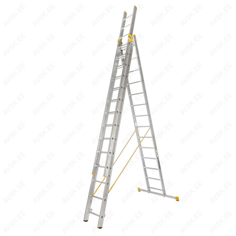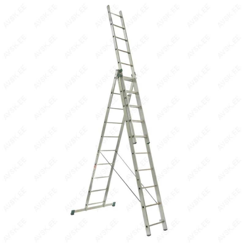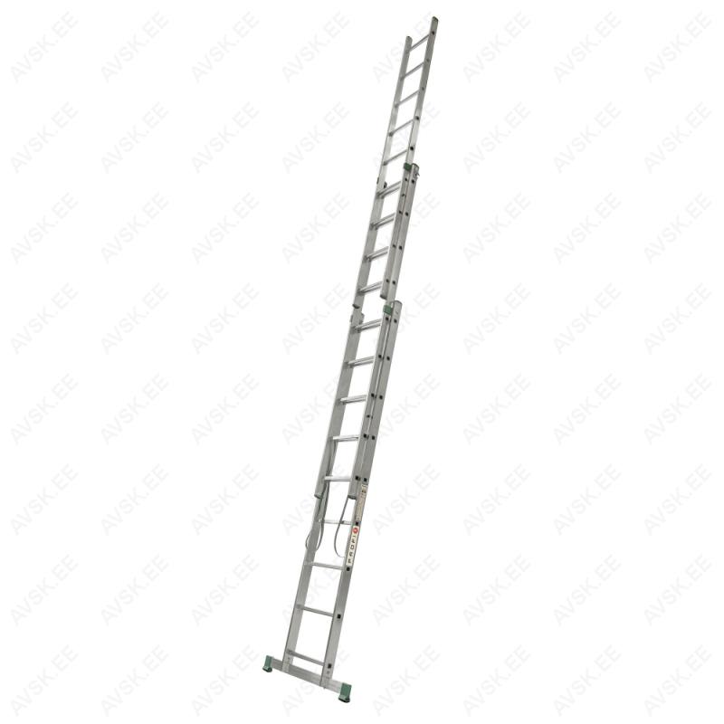 Kolmeosaline alumiiniumist universaalne mitteprofessionaalne redel HELPER, astmete arv 3 x 9, üldpikkus 5,69m , laius 454 mm. Mõõdud vt joonist: A Transpordipikkus - 2,58 mB 3-osa teleskooppikkus - 5,69 mH 3-osa teleskoopkõrgus - 5,39 mb A - vormi teleskooppikkus - 3,98 mh A - vormi teleskoopkõrgus - 3,78 mF Stabilisaatori pikkus - 800 mmR Astmete arv - 3 x 9Kandevõime 150 kgKaal 13,7 kg