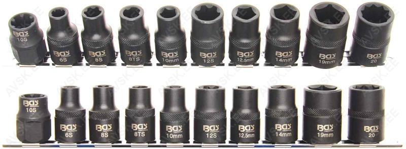 - 10S, 6-kant, Toyotale - 6S, 6-kant, Nissan & Renault sidurile - 8S, 6-kant, Nissan silindripeale - 12S, 6-kant, Nissan silindripeale - 8TS, 3-kant, Nissan - 10 mm, 5-kant, pidurisüsteemidele - 12 mm, 5-kant, Nissan kütuepumbale - 14 mm, 5-kant, Opel & Smart - 19 mm, 5-kant, Peugeot, Renault & Citroen seisupidurile - 20 mm, 10-kant, Honda Civic - pikkus: 38 mm