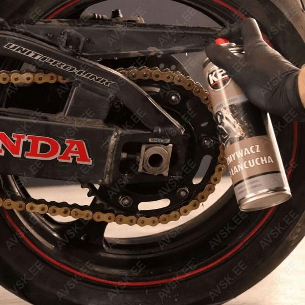 Suure jõudlusega puhastusvahend igasugustele mootorrataste. kartide. ATV. jalgrataste jne kettidele. Eemaldab kiirelt õli. määrded. muda ja muu mustuse. kaitseb korrosiooni ja enneaegse kulumise eest. eemaldab niiskuse. Kasutamine: enne kasutamist loksutage korralikult. pihustage ohtralt ketile ja ketiratastele. oodake 10-15 min ja loputage mustus maha voolava veega või lapiga. Eriti suure mustuse korral kasutada puhastusharja. Pärast igat puhastamist tuleks kett põhjalikult kuivatada ning määrida ketimäärdega. Erinevalt bensiinist või muudest lahustitest on K2 ketipuhastusvahend ohutu igat tüüpi kettidele. sealhulgas O-. Z- ja X-tüüpi kettidele. samuti laki- ja kummipindadele.