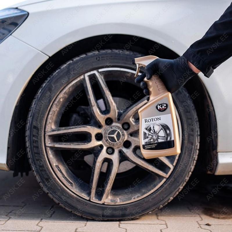 K2 ROTON eemaldab suurepäraselt kogu tõrksa mustuse. sealhulgas piduriklotside ladestused ja teemustuse. mille tulemuseks on peale kantud vedeliku punane värv. Sellega velgede pesemine on kiire ja tõhus ning ei nõua pingutust. Mustus eemaldatakse ilma puhastatava pinna kriimustamise ohuta. Sobib kasutamiseks igat tüüpi velgedel – teras. alumiinium. kroom ja lakitud.