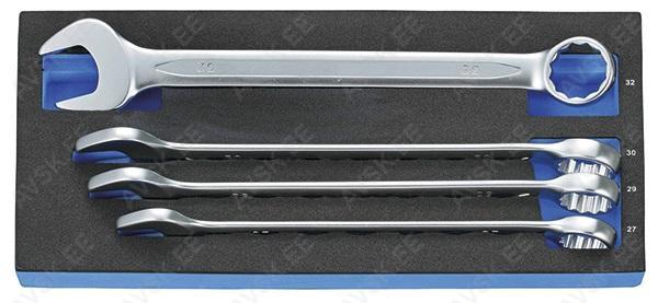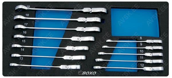 Tööriistad asuvad pehmetes "EVA"-paneelides. Paneelide pesa on teist värvi, mis aitab märgata puuduva tööriista kuju. -Avainväli 1/4", 5/16", 11/32", 3/8", 7/16", 1/2", 9/16", 5/8", 11/16", 3/4", 13/16", 7/8", 15/16" Tööriistad asuvad pehmetes "EVA"-paneelides. Paneelide pesa on teist värvi, mis aitab märgata puuduva tööriista kuju. -Avainväli 8, 9, 10, 11, 12, 13, 14, 15, 16, 17, 18, 19mm-Muuntokappaleet neliövääntiöille: -1/4" - 10mm -3/8" - 13mm -1/2" - 19mm Tööriistad asuvad pehmetes "EVA"-paneelides. Paneelide pesa on teist värvi, mis aitab märgata puuduva tööriista kuju. Avainvälit 8, 9, 10, 11, 12, 13, 14, 15, 16, 17, 18, 19 mm