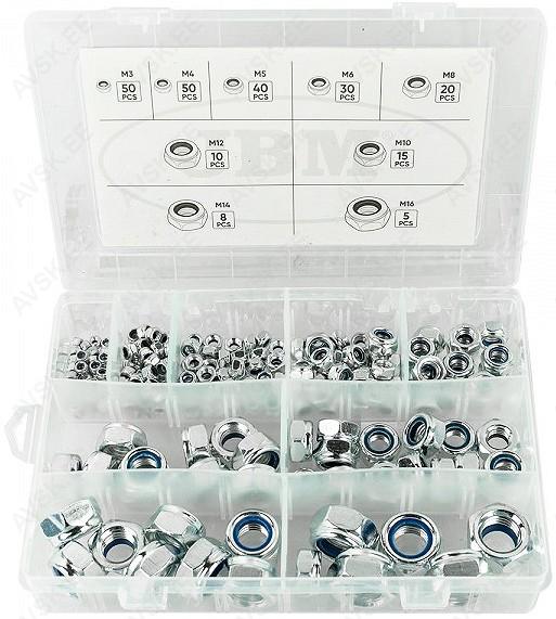 Tsingitud, tugevus 8.8. Komplektis 128 tk. Täiskeere DIN 933: M5x10, M5x20, M6x16, M6x20, M6x30, M6x40, M8x20, M8x30, M8x40, M8x50. Osakeere DIN 931:M6x50, M6x60, M8x60, M8x80 Tsingitud kuuskantmutrid. 467 tk. Kuuskantmutter DIN 934:M4, M5, M6, M8, M10, M12 Lukustusmutter DIN 985:M4, M5, M6, M8, M10, M12 Peenkeermega lukustusmutter DIN 934:M8x1,0, M10x1,25 Äärikuga kuuskantmutrid DIN 6923:M6, M8