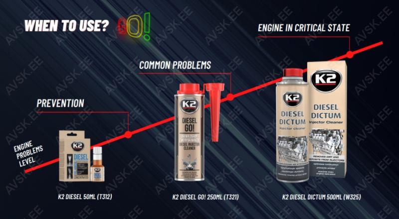 K2 DIESE GO! on professionaalne kütuselisand. mis on spetsiaalselt ette nähtud kõrgsurvepihustite ja common rail diiselmootorite jaoks. Diislikütusele lisatuna lahustab kõrgsurvepumpades. sissepritsesiinides japihustites tekkinud setteid. Selle tulemusena puhastab see pihustid ja pihustiotsikud ning parandab pihustite tööd. K2 DIESELGO! on suurepäraste puhastus- ja määrimisomadustega. tänu millele pikendab kogu toitesüsteemi eluiga.