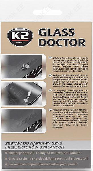 K2 GLASS DOCTOR on klaasiparanduskomplekt mis täidab praod ja väiksemad kahjustused tuuleklaasil. Komplektis sisalduv vaik täidab klaasil olevad praod ning pärast kokkupuudet päikesekiirtega kivistub ja jääb täiesti läbipaistev.
