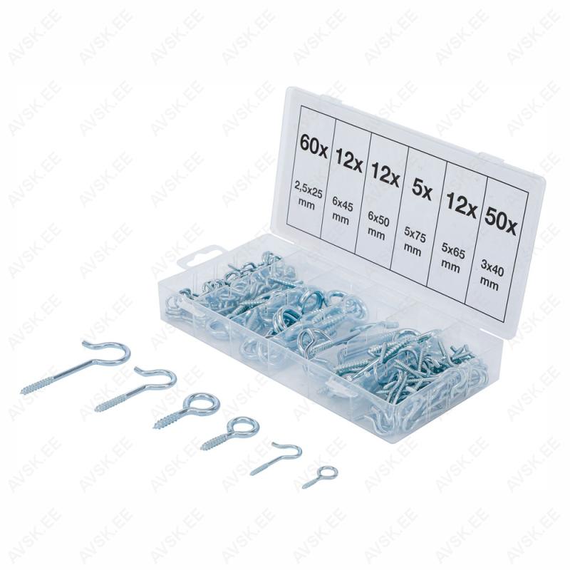 Meetriline nailonist sisestusega plastikust hoiukarbis Komplektis: 35 kuuskantmutrit, iselukustuv, M435 kuuskantmutrit, iselukustuv, M525 kuuskantmutrit, iselukustuv, M625 kuuskantmutrit, iselukustuv, M816 kuuskantmutrit, iselukustuv, M1010 kuuskantmutrit, iselukustuv, M12Brutokaal 627 g Pinnaviimistlus - kroomitud Pakend sobib seinale riputamiseks Komplektis: 6 karabiini 36 x 17 mm, Ø 3,5 mm 4 karabiini 40 x 20 mm, Ø 4,0 mm 4 karabiini 49 x 23 mm, Ø 5,0 mm 2 karabiini 58 x 27 mm, Ø 6,0 mm 2 karabiini 65 x 31 mm, Ø 7,0 mm 2 karabiini 75 x 34 mm, Ø 8,0 mm Brutokaals 566 g Pakend sobib seinale riputamiseks
