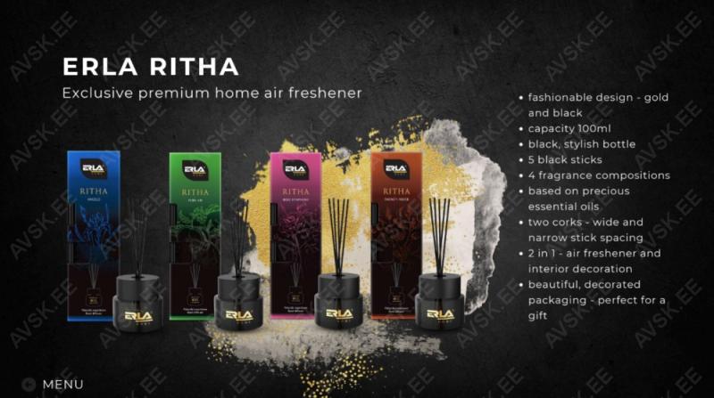 Erla RITHA on stiilne õhuvärskendaja pulkadega lõhna hajuti kujul. Elegantne ja praktiline. Tänu sellele saate hõlpsalt värskendada ja kaunistada ruumi. kodus. kontoris ja kus iganes soovite. Õhuvärskendaja luksuslik vorm kaunistab ruumi ja täidab selle maitseka lõhnaga. mis kestab kuni 9 nädalat. Pilkupüüdev dekoratiivne must pudel sobib ideaalselt igasse interjöör. Erla RITHA õhuvärskendajat saate edukalt kasutada ka soovimatute lõhnade maskeerimiseks. Minimalistlik ja elegantne pudel ja eeterlike õlide rikas lõhnaessents pakuvad loomulikku ja intensiivset lõhna. Lõhnaga küllastunud pulgad eraldavad aroomi järk-järgult. Erla RITHA lõhna intensiivsust saab pulkade hulgaga reguleerida. Mida rohkem pulki on essentsi kastetud. seda tugevam on lõhn. Suurtes ruumides saab RITHA õhuvärskendajaid omavahel kombineerida. et luua ainulaadseid aroomikompositsioone.