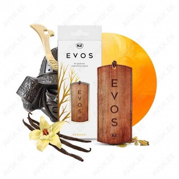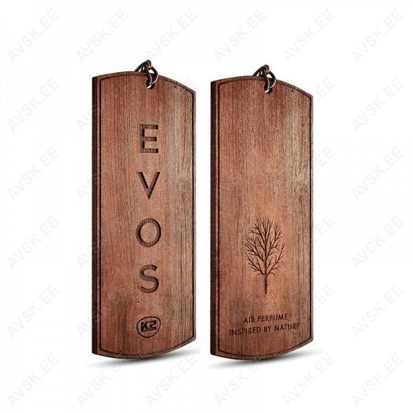 K2 EVOS on loodusest inspireeritud ebatavaline auto õhuvärskendaja puidust ripatsi kujul. Kahepoolse graveeringuga täispuidust ripats kaunistab auto sisemust ja annab sellele elegantsi. Spetsiaalselt valitud eeterlike õlidega lõhnad köidavad lõhna rikkalikkuse ja sügavusega pikka aega. Punutud tume nöör võimaldab seda riputada kõikjale.