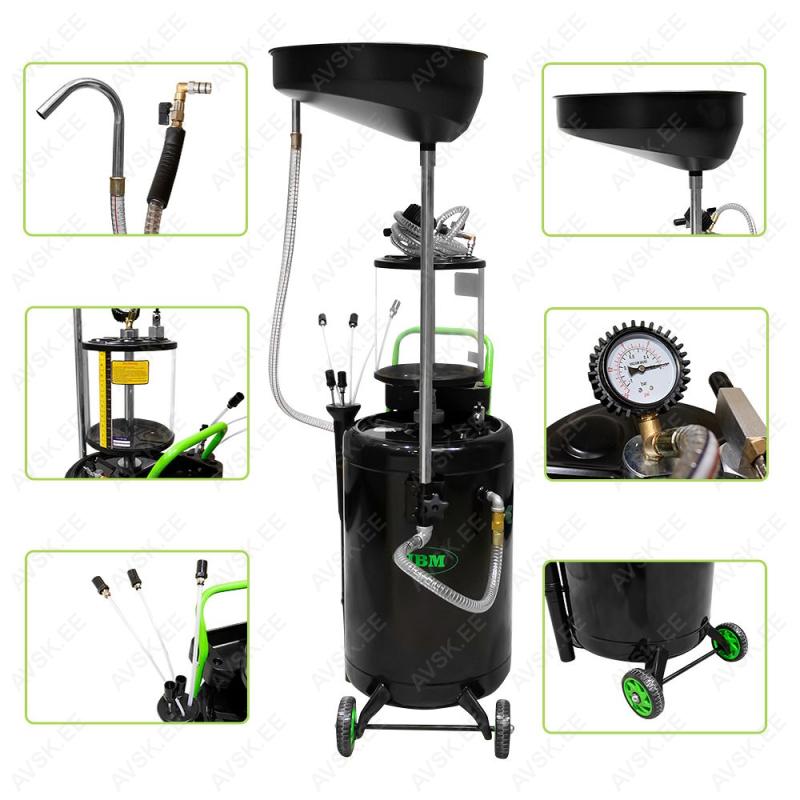 Klaasanumaga õlikoguja. Komplektis kaasas imemiskõrred. Tänu 10 l klaasanumale. millel mõõteskaala. on võimalik hinnata õli mustuse astet. mahtu jne. Õlikollektori maht 10 l. vahekraani ja sõelaga (et õlikork paaki ei kukuks). Ratastel õlipaagi maht 70 l. Kasutab töötamiseks suruõhku. 8-10 bar. Imemishõrendus 0-0.8 bar. Kogukaal 22 kg. Õlikogur on kaetud keemia- ja õlikindla erivärviga.