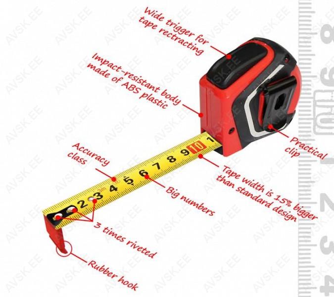 Mõlemale poolele trükitud skaala. Ülemine pool kollasel taustal skaalaga. alumine pool valgel taustal skaalaga. Täpsusklass II. Kulumiskindla ja libisemist soodustava nailoniga kaetud pind. Standardsest 15% laiem mõõdulint tagab suurema püsivuse ilma murdumiseta. Matt pinnakate. Suured. selgelt loetavad numbrid. Kiire ja mugav Autostop funktsioon - mõõdulint lukustub automaatselt pärast väljatõmbamist. ei pea eraldi lukustama. Spetsiaalne kummiga kaetud otsik väldib mõõdulindi otsa mahalibisemise mõõdetavalt pinnalt. Kummiga kaetud ABS plastist põrutuskindel korpus. Kolme needi ja lisatugevdusega otsik.