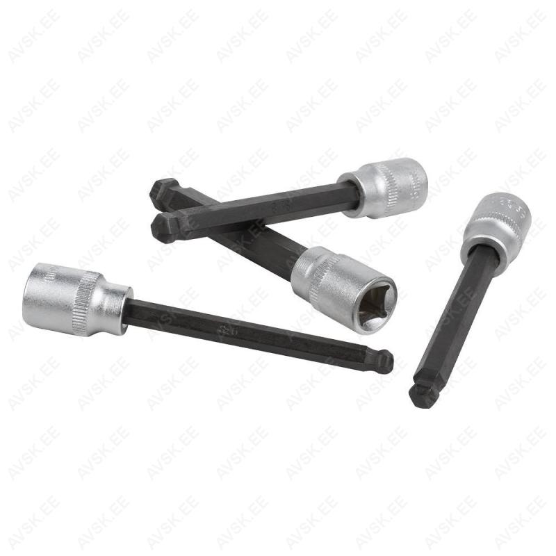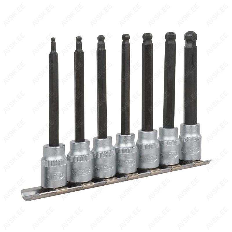 Kuulpeaga pikad kuuskant padrunotsikud. Tänu kuulotsale saab polte keerata ka nurga all. Pikkus 100 mm. komplektis mõõdud 4-5-6-7-8-10 mm. Metallsiinil.