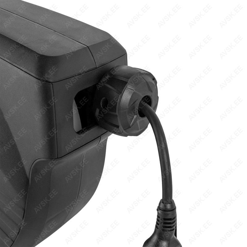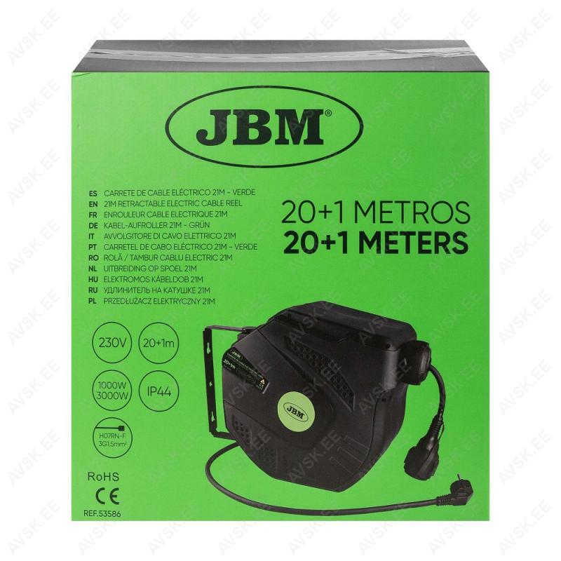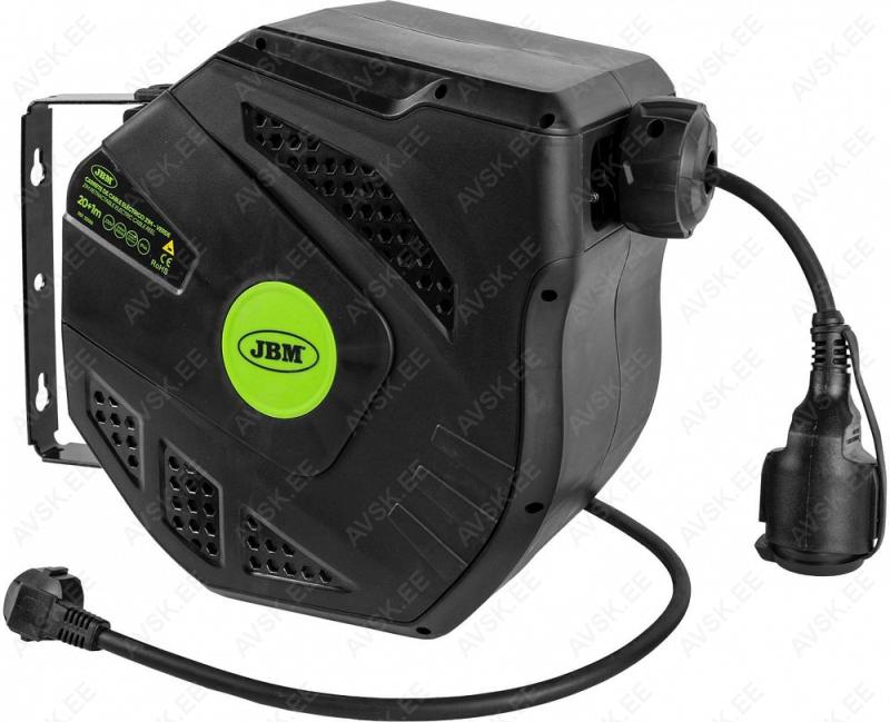 Töökoja kasutusse mõeldud pikendusjuhe plastkassetis. seinakinnitusega. Automaatse tagasikerimisega. Kinnitusjalal keeratav 180°. Kaabel 20 m. sisendkaabel 1 m pikkune. 3x1.5 mm². Kaabli tüüp H07RN-F3G1.5MM2. Koormustaluvus 3000 W täielikult lahtikerituna. poolile kerituna 1000 W. Ülekoormuskaitsega. Kaal 8.35 kg. IP44. kasutatav ka õues.