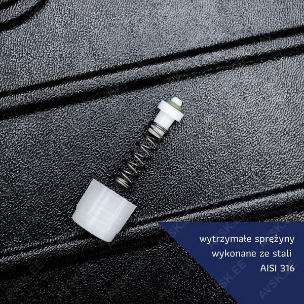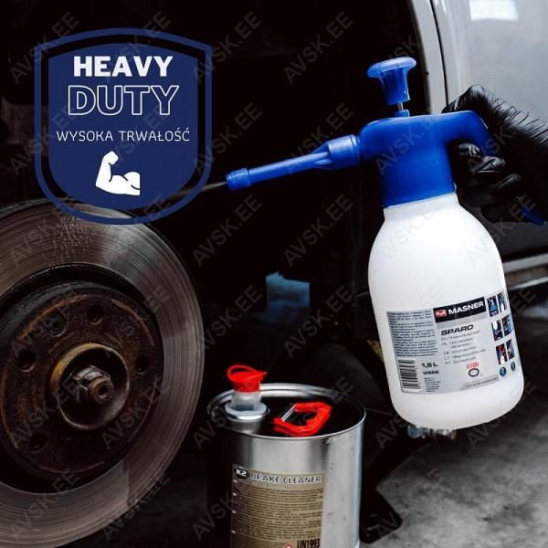 Professionaalne käsiprits Masner SPARO on detergentide ja keemiliselt aktiivsete leeliseliste ainete lahuste pealekandmiseks. Pritsi iseloomustab kõrge keemiline vastupidavus. kindel konstruktsioon ja kasutusmugavus. Tänu Viton® FPM tihenditele on see vastupidav õlidele. rasvadele. bensiinile ja teistele tugevatoimelistele kemikaalidele. Viton® tihend on spetsiaalne fluorikummist valmistatud elastomeer. Seda materjali iseloomustavad minimaalne takistuse vähenemine kuumuse mõjul. väga kõrge keemiline vastupidavus. mittesüttivus. madal gaasi läbilaskvus. vastupidavus madalrõhu tingimustele. kasutamise võimalus osoonikeskkonnas. vastupidavus UV-kiirgusele ja aromaatsetele süsivesinikele. Ei sobi kasutamiseks järgmiste ainetega: vesinikkloriidhape. naatriumhüpoklorit. leelised. viskoossed ja paksud vedelikud. vedelikud temperatuuriga üle 40°C.