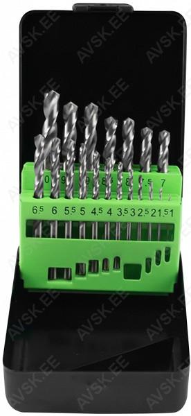 Metallkarbis HSS-G metallipuurid hobi ja kodukasutamiseks. HSS 4341 eriteras. Komplekt sisaldab mõõte 1.0-1.5-2-2.5-3-3.5-4-4.5-5-5.5-6-6.5-7-7.5-8-8.5-9-9.5-10 mm.