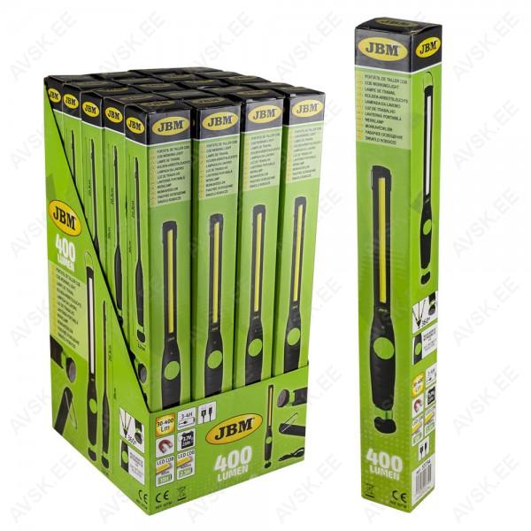 COB valgusdioodidega (nn riba-LED) töölamp/kandelamp. Valgusjõud on nupust sujuvalt reguleeritav 30-400 lm. Aku 2600 mAh. tööaeg 5-10 h. Magnetalus. riputusaas. 177 g.