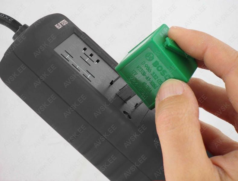 Suurepärane abivahend igasse autoremonditöökotta. Testib kõik enamlevinud elektro-mehhaanilised 4- ja 5 jalaga releed. 12 V süsteemidele. Relee toimivus kuvatakse punase või rohelise indikaatortule süttimise abil.