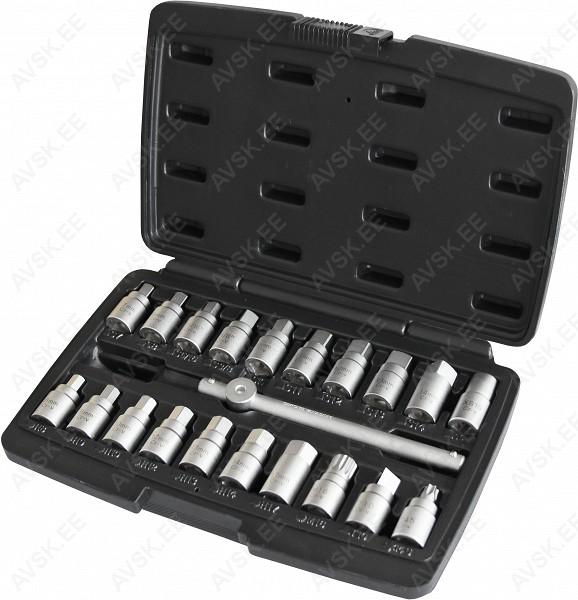 Valmistatud CrMo terasest. 3/8” võtmega keeratavad (3/8” keeramissaba komplektis kaasas). Komplektis mõõdud: 4-kant välis 8-11-12-13-14- 5/16”-3/8”-1/2”. 6-kant välis 8-9-10-12-14-17-5/16”-3/8”-1/2”. 3-kant välis 10 mm. 12-tähik XZN16 VW. 4-kant sise 10 mm.