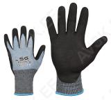 Lõikekindlad töökindad. peopesa kaetud kareda liivakarva vahtnitriilkummiga. lõikekindlustase B. Lõikekindlad kindad on elastsed ja väga mugavad kõrgtehnoloogilisest kiudutest valmistatud töökindad. Kinnaste peopesa on kaetud õhukese hingava vahtnitriilkummiga. mis kaitseb õlide. määrdainete ja mehhaanilise kulumise eest ja tagab hea haarde kuivas ja niiskes keskkonnas. Õmblusteta töökindad. tagavad hea sõrmeotste tundlikkuse. Katmata käeseljas olev Spandex materjal tagab eriti hea käte hingavuse. mugavuse ja painduvuse. Materjal: HPPE. teraskiud. polüester. Spandex. Lõikekindlus EN ISO 13997 - tase B. Kude ehk silmade arv 18.