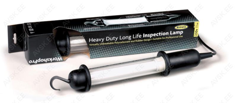 Töölamp 220 V. "RING Long Life PROFI" Löögikindla polükarbonaat- ja kummikorpusega, niiskuskindla lülitiga, vahetatava 11W kahetorulise päevavalguslambiga.