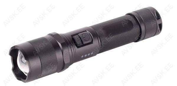 Varustatud väga võimsa OSRAM P9 10W LED-iga. Metallkorpusega ja pritsmekindel (IPX4). Pikkus 155 mm, laius 38 mm ja kaal 195 g. Töötab laetavate 2200 mAh 18650 akudega (komplektis) või 3xAAA patareidega (ei kuulu komplekti). Varustatud aku laetuse indikaatoriga. Laadimine kaasasoleva USB-kaabli abil. 4 erinevat funktsiooni: ere (100%), pool võimsust (40%), lugemisvalgus (10%), vilkuv tuli. Toite ja funktsioonide jaoks eraldi nupud. Reguleeritav valgusvihk ja kaugus kuni 250 m. Valgusvoog / tööaeg 18650 patareiga: 1000 lm / 3 h, 400 lm / 7 h, 100 lm / 17 h ja vilkuv tuli / 6 h. 3xAAA patareidega: 450 lm / 3 h, 200 lm / 5-6 h, 50 lm / 18-20 h ja vilkuv tuli / 24 h. Varustatud kanderihmaga.