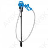 Kompaktne ja kerge elektriline pumbakomplekt AdBlue. diiselkütuse. jahutusvedeliku või klaasipesuvedeliku pumpamiseks. 12 V või 230 V. Käepärane sisse/väljalüliti koos LED märgutulega. Sisseehitatud ülekoormuskaitse ja vaikne mootor. Tõusutorusse sisseehitatud roostevabast terasvõrgust filter vältimaks mustuse sattumist pumpa. Komplektis kaasas kahed erinevad vaadiadapterid. Teleskoop tõusutoru reguleeritav vahemikus 850-1245 mm. seega sobib 200 l vaatidele ja 1000 l IBC mahutitele. Varustatud 2 m pikkuse vooliku ja manuaalse püstoliga. millel roostevaba terasest otsik. Max tööaeg järjest 15 min. seejärel 15 min puhketsükkel. Tootlikkus kuni 18.4 l/min.