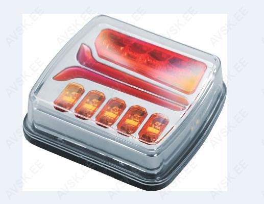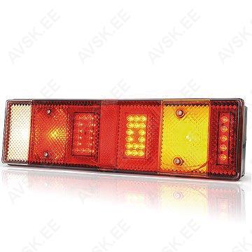 taga-, piduri-, suuna-, udu-ja tagurdustuli , laius 398 x kõrgus 128 x sügavus 46 mm, IP67, juhe 400mm, kinnitusaukude vahe 152mm, ECE R3, R6, R7, R23 LEDide arv 36 Materjal Klaas: PMMA, Korpus: ABS+PC Paigaldus Poldid Funktsioon park, stopp, suunatuli (dünaamiline), reflektor Võimsused 2,5 W, 2 W, 2,7 W Pinge 12 V/24 V Sertifikaadid ECE R10, ECE R148, ECE R150 Mõõdud 110x70x22 mm Juhe 300 mm