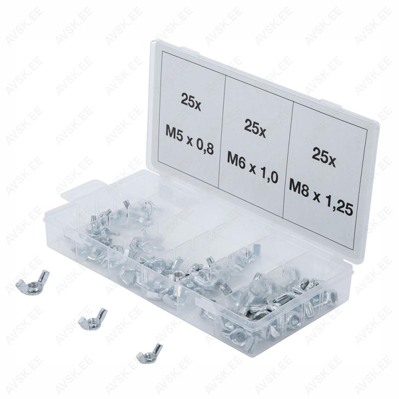 metric with nylon insert in plastic storage case scope of delivery: 35 hexagon nuts, self-locking, M4 35 hexagon nuts, self-locking, M5 25 hexagon nuts, self-locking, M6 25 hexagon nuts, self-locking, M8 16 hexagon nuts, self-locking, M10 10 hexagon nuts, self-locking, M12