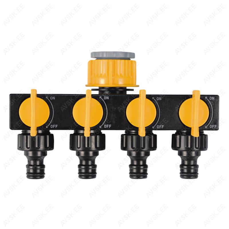 - Allows connecting up to four garden hoses with quick connectors
