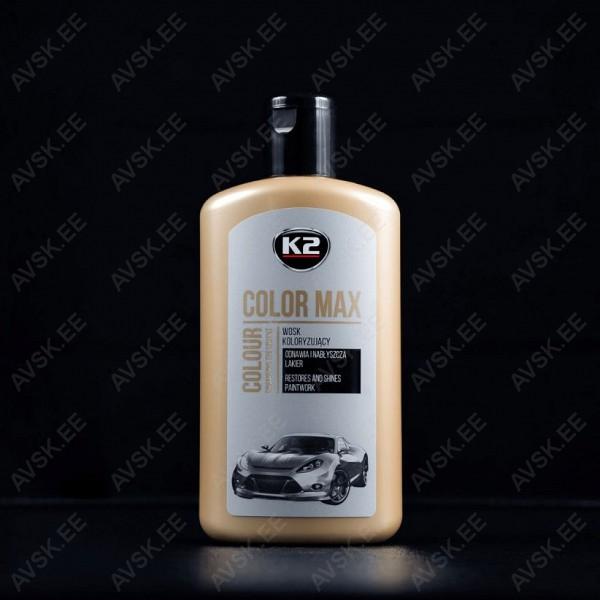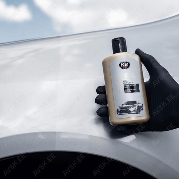 K2 Color Max värvivaha sobib igat tüüpi autovärvidele. ka metalliseeritud värvidele. Elustab suurepäraselt värvi ja tänu Carnauba vahale taastab värvipinna endise läike. K2 Color Max värvivaha regenereerib uued ja vanad lakid. värskendab suurepäraselt välimust ja elustab värvi nii uutes kui ka vanades värvides. See on mõeldud kasutajatele. kes soovivad parandada värvikatte seisukorda. ilma värvikatet mehaanilise poleeriga korrigeerimata. Täidab tõhusalt kõik laki ebatasasused ning kõvenedes loob ühtlase ja sileda pinna. Maskeerib suurepäraselt väiksemad kriimud. mõrad ja muud värvidefektid. Peale tooniva vaha kasutamist muutub autovärv ühtlasemaks. mis saab tagasi oma sära ja atraktiivse välimuse. Lihtne peale kanda. Poleerimine ei nõua jõu kasutamist. Seda ei tohi kanda kuumale lakile otsese päikesevalguse käes.