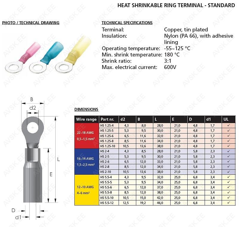 Pressitav termokahaneva polüamiidisolatsiooni ja liimiga veekindel juhtmeotsik. mis tagab tugeva ja tiheda ühenduse ning on vastupidav kütustele. õlidele. akuhapetele ja muudele tehnilistele vedelikele.