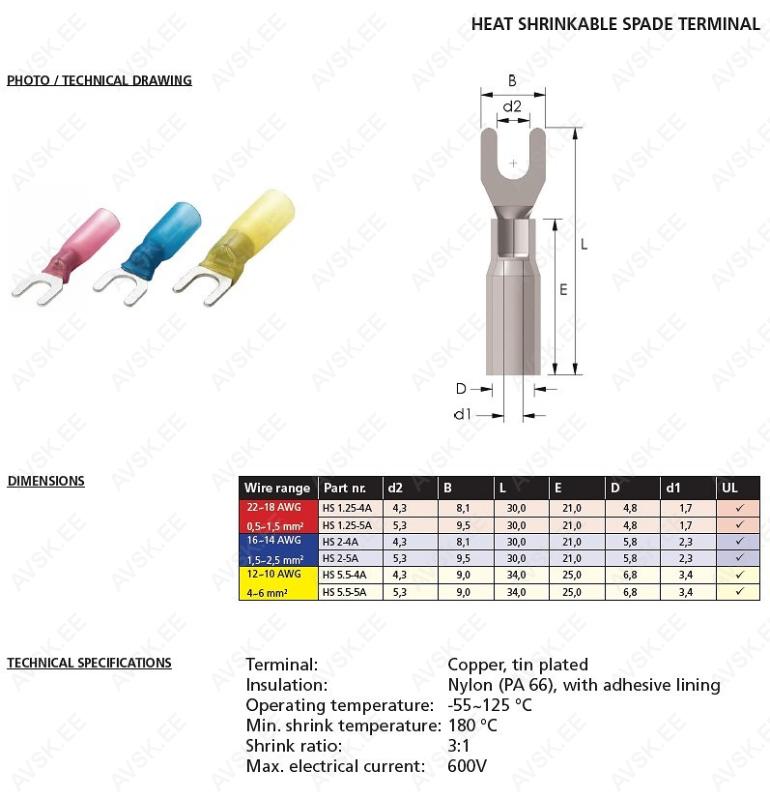 Pressitav termokahaneva polüamiidisolatsiooni ja liimiga veekindel juhtmeotsik. mis tagab tugeva ja tiheda ühenduse ning on vastupidav kütustele. õlidele. akuhapetele ja muudele tehnilistele vedelikele.