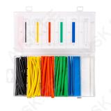 Komplektis on järgmised termokahanevad torud pikkusega 100 mm: toru 1,5mm must 30tk. toru 2,5mm kollane 30tk. toru 4mm punane 20 tk. toru 6mm roheline 10 tk. toru 10mm sinine 6 tk. toru 13mm valge 4 tk.