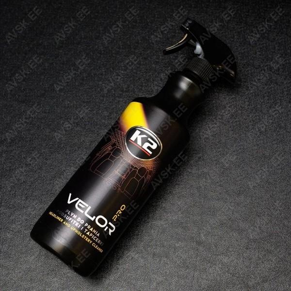 K2 VELOR PRO laepolstri puhastusvahend on ainulaadne. mugav. kasutusvalmis toode. mis ei vaja lahjendamist. Spetsiaalselt välja töötatud mustuse eemaldamiseks riidest polstrilt ja vaipadelt. Toode on täiesti ohutu puhastatavatele pindadele. K2 Velor Pro eemaldab tõhusalt plekid ja mustuse ega vaja loputamis. K2 VELOR PRO ei oma negatiivset mõju puhastatava materjali värvile ja struktuurile. See sobib ideaalselt katusevoodri käsitsi puhastamiseks nii mikrofiiber lapi või harjaga. K2 VELOR PRO on värske ja meeldiva mandariinilõhnaga.