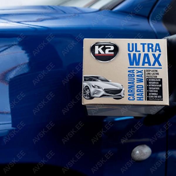 K2 ULTRA WAX on kvaliteetne universaalne pasta kujul olev kõvavaha. mis on mõeldud igat tüüpi värvidele (tavaline. metalliseeritud. pärlmutter jne). millega saate oma auto kere särama panna ja kaitsta seda. Spetsiaalselt välja töötatud valem ühendab endas loodusliku CARNAUBA vaha ja polümeeri nanoosakesi. See kombinatsioon loob värvipinnale isoleeriva kihi. mis säilitab läike ja hüdrofoobse efekti ka peale mitut pesu. K2 ULTRA WAX vahaga kaitstud pind peab suurepäraselt vastu ilmastikutingimuste kahjulikele mõjudele nagu UV-kiirgus ja happevihmad. samuti kaitseb teereostuse eest. Parima visuaalse efekti saavutamiseks soovitame värvi enne toote pealekandmist põhjalikult puhastada. Auto pesemiseks tasub raskema mustuse korral kasutada šampooni K2 EXPRESS ja pigieemaldusvahendit K2 TAR REMOVER.