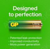 GP ULTRA Alkaline patareid on kuni 80% energiatõhusamad. Patareid sobivad ideaalselt igapäevaselt kasutatava koduelektroonikas ja seadmetes ning valgustites kasutamiseks. Tootmisel kasutatakse taaskasutatavaid materjale. pakend on plastivaba. Tooted on sertifitseeritud Skandinaavia "Joutsen" jätkusuutlikusele vastavaks.