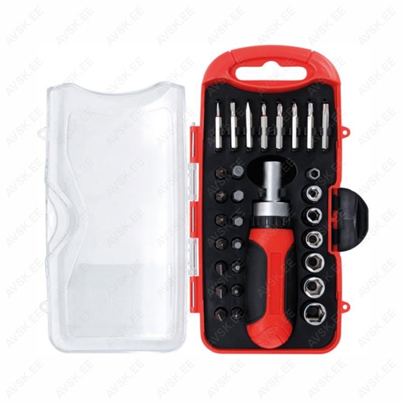 1 magnetic bit holder, 6,3 mm (1/4") drive, 6,3 mm (1/4") drive 3 precision bits, 6,3 mm (1/4") drive, cross slot PH: PH: PH0 - PH1 - PH2 5 bits, 6,3 mm (1/4") drive, slot SL: 3 - 4 - 5 - 6 - 7 mm 4 bits, 6,3 mm (1/4") drive, T-Star (for Torx): T10 - T15 - T20 - T30 1 bit ratchet, reversible, 6.3 mm (1/4") 8 sockets, hexagon, 6.3 mm (1/4") drive, sizes: 5 - 6 - 7 - 8 - 9 - 10 - 11 - 12 mm 1 ... 1 magnetic bit holder, 6,3 mm (1/4") drive, 4 mm (5/32") drive 3 precision bits, 4 mm (5/32") drive, cross slot PH: PH00 - PH0 - PH1 3 precision bits, 4 mm (5/32") drive, slot SL: 2 - 3 - 4 mm 2 precision bits, 4 mm (5/32") drive, T-Star (for Torx): T10 - T20 3 bits, 6,3 mm (1/4") drive, cross slot PH: PH0 - PH1 - PH2 2 bits, 6,3 mm (1/4") drive, cross slot PZ: PZ0 - PZ1 3 bits, 6,3 mm (1/4"...